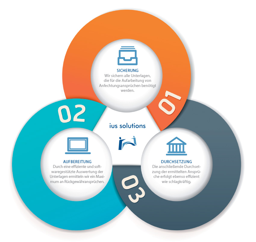 Die ius solutions GmbH vereint bewährte und gänzlich neue technische Lösungen zur Durch­setzung von Anfechtungsansprüchen und anderen Sonderaktiva mit einer jahrelangen Spezialisierung auf dem Gebiet der insolvenz­spezifischen Ansprüche.